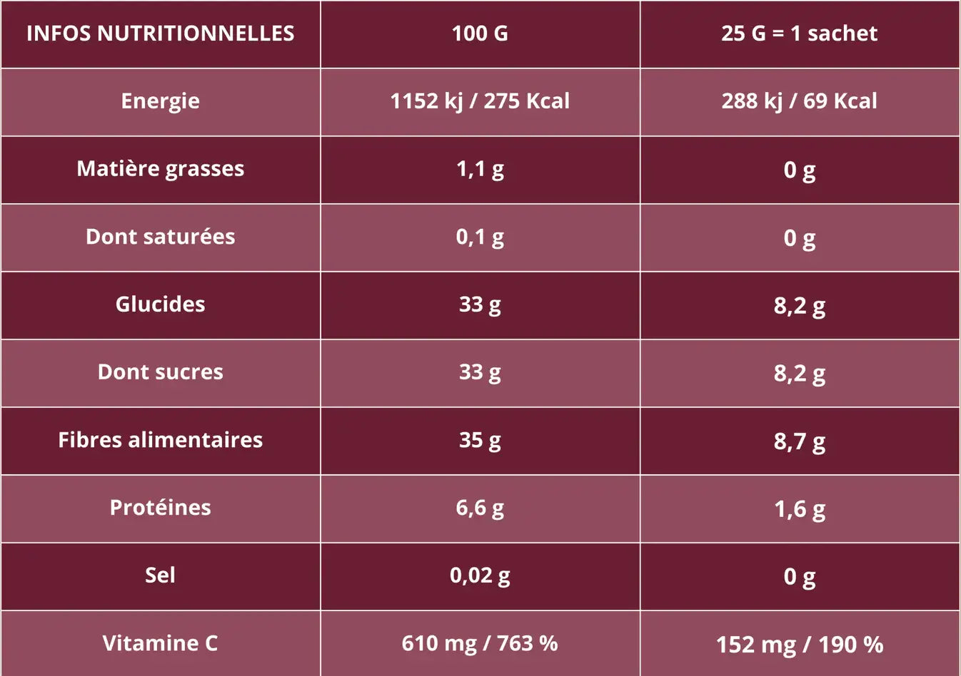 Sachet refermable de 25 g → équivalent à plus de 100 g de cassis frais, concentrés pour garder l’essentiel : le goût et les nutriments.