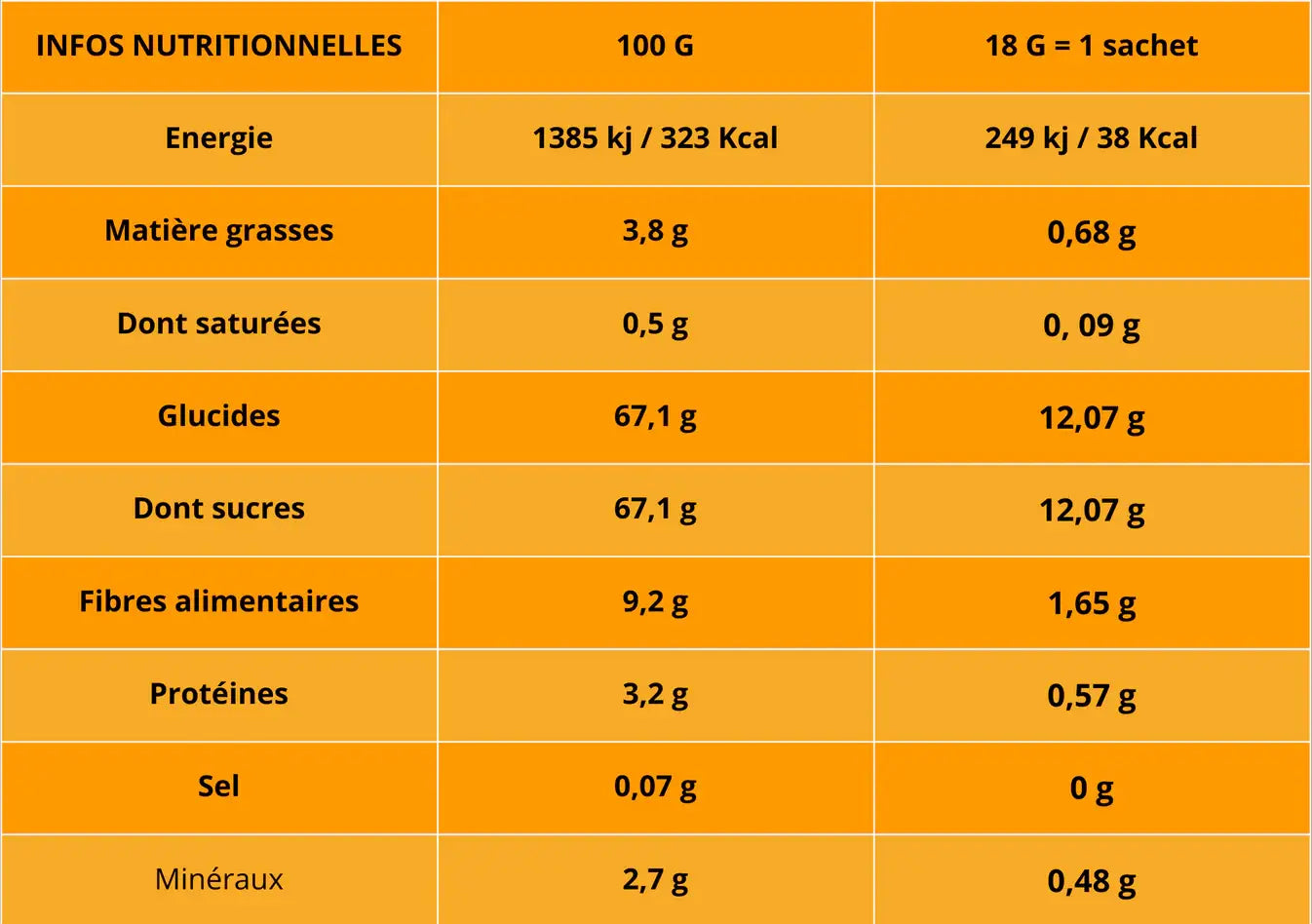 Sachet refermable de 18 g → équivalent à plus de 108 g de mangues fraîches, concentrées pour garder l’essentiel : le goût et les nutriments.