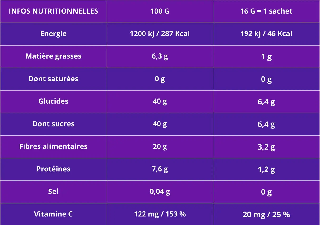 Sachet refermable de 16 g → équivalent à plus de 112 g de mûres fraîches, concentrées pour garder l’essentiel : le goût et les nutriments.
